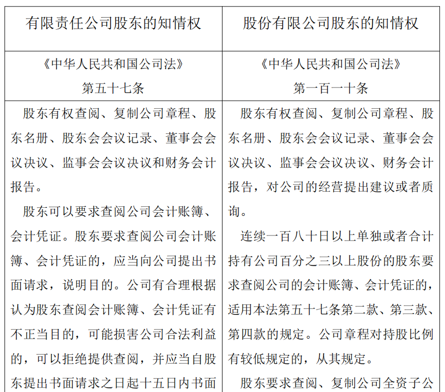 《公司法》第五十七条规定了有限责任公司股东的知情权,根据权利行使的条件与方式,可将其细分为绝对知情权、相对知情权。