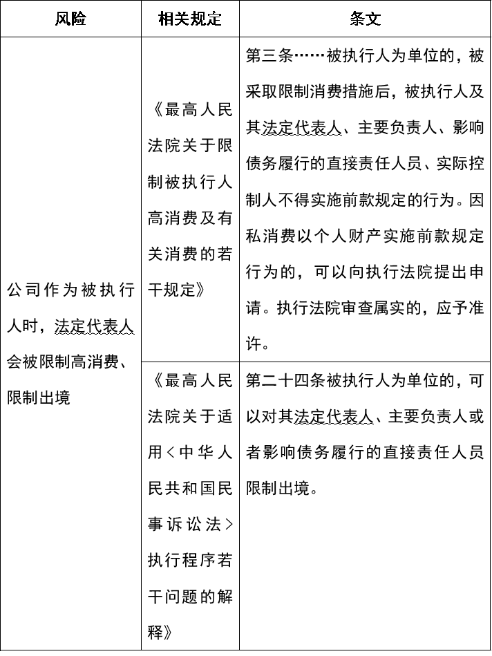 综上,担任法定代表人的主要风险是公司败诉后不履行债务,相对方可以向法院申请强制执行,并要求法院同时对法定代表人采取限制高消费措施(如禁止乘坐高铁、飞机)、限制出境,并将其列入失信被执行人名单。